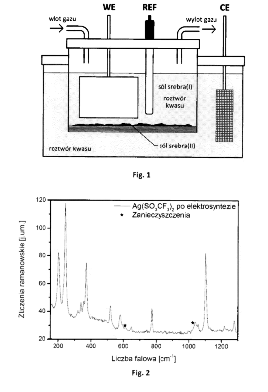 Description: The subject of the application is a method of electrochemical synthesis of high-purity silver(II) salts, which is characterized by the electrolysis of silver(I) salts or silver(I) hydrosalts in a solution of an acid containing the same anion as the electrolyzed salt, preferably an inorganic oxanion or an inorganic oxofluoroanion of a non-metal at a high degree of oxidation, preferably a non-metal such as C(IV), N(V), P(V), S(VI), Se(VI), Te(VI), Cl(VII), Br(VII), I(VII). During electrolysis, a concentrated solution of the acid is used, preferably a solution with a concentration above 80%, preferably a solution with a concentration higher than or equal to 95%, with the permissible contamination of the acid being water, anhydride of this acid or another solvent forming solutions of the appropriate silver(I) salt and this acid, possibly with the addition of an electrolyte. The notification also covers products obtained by this method and the method of synthesis of high-purity silver(II) salt hydrates and products obtained by this method.